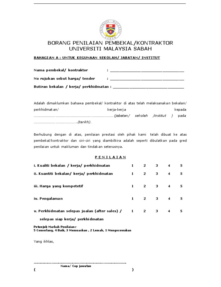Jangkamasa pengukuran prestasi pembekal yang dibuat bermula 1 januari hingga 31 disember 2015. Adakalanya pekerja dikehendaki untuk menilai diri mereka sendiri dengan mengisi borang penilaian. June 23, 2012 0 comments. Arti dan pentingnya penilaian prestasi kerja penilaian prestasi kerja (ppk) adalah suatu cara dalam melakukan evaluasi terhadap prestasi kerja para pegawai dengan serangkaian tolak ukur tertentu yang obyektif dan berkaitan langsung dengan tugas seseorang serta dilakukan secara berkala. Menurut t.hani handoko (1995:135) terdapat sepuluh manfaat. Borang jpa pa 1 2009 : Borang b akta kemudahan dan perkhidmatan jagaan kesihatan swasta 1998. Isoptd 02 02 borang prestasi pembekal pindaan 01 mac2011 pdf ptd 02 02 borang penilaian prestasi pembekal kontraktor nama pembekal course hero. Penilaian prestasi adalah salah satu aktiviti terpenting dalam amalan pengurusan sumber manusia. Contoh borang penilaian prestasi yang boleh dijalankan ke atas pekerja. Dalam arti harfiahnya, vendor adalah penjual atau pemasok. Kad pengenalan jawatan tarikh dan masa pemantauan nama. Borang penilaian prestasi (pegawai pegawai bahagian iv & v) garispanduan perlaksanaan sistem pengurusan prestasi baru dalam perkhidmatan awam (terkini) borang penilaian prestasi lama: